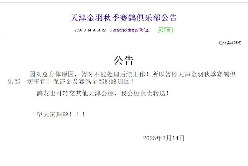 就3月14日上午9点,天津金羽秋季赛鸽俱乐部发布一则公告:因刘总身体原因,暂时不能处理后续工作!所以宣布暂停当前天津金羽秋季赛鸽俱乐部一切事宜,保证金及赛鸽全部原路退回!