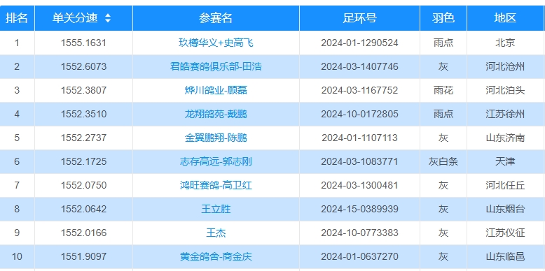 归巢消息:12点25分57秒,首羽顺利归来。夺得冠军的是玖樽华义+史高飞的2024-01-1290524雨点,分速1555.1631米/分。1秒后,亚军由君皓赛鸽俱乐部-田浩的2024-03-1407746灰,分速1552.6073米/分。接着,季军则被烨川鸽业-顾磊的2024-03-1167752雨花拿下,分速为1552.3807米/分。