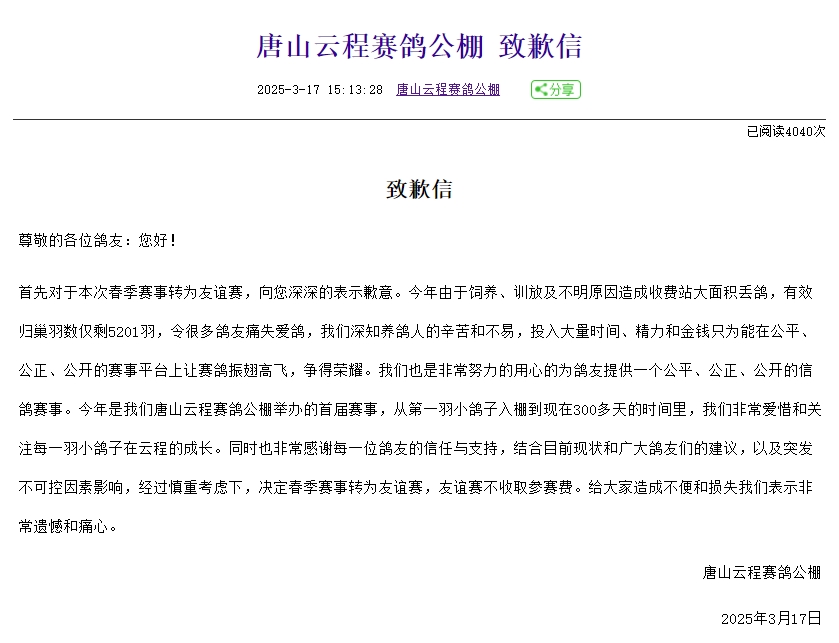 3月17日,公棚发布致歉信:“经过慎重考虑下,决定春季赛事转为友谊赛,友谊赛不收取参赛费”。