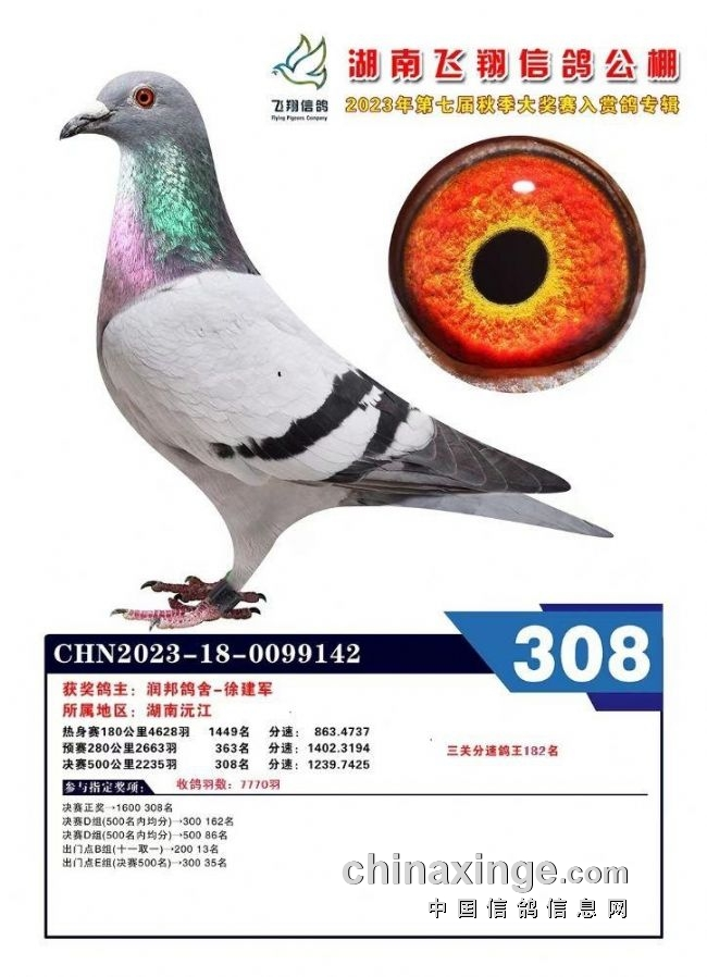 23年湖南飞翔公棚决赛308名(2235羽)鸽王182名(与117名同窝) 预赛363名——灰姑娘(雷神直女)