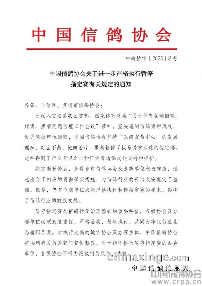中鸽协就是搅屎棍,现在指定不抽成了,你就暂停,你一点不为鸽友想,公棚6500羽开奖,收18000羽,你什么意思!都三倍羽数的收,你是在保护谁的利益!