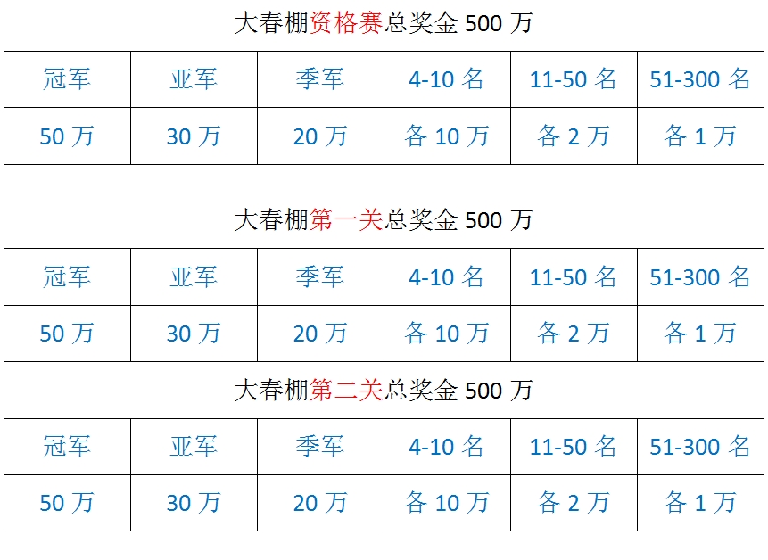 本届开尔大春棚在去年公布的各关比赛录取名额的基础上自200公里资格赛到400公里预赛各增300个获奖名额,共900个单项奖,奖金额度在6500万的基础上再加1500万,整体开奖羽数达到了8000羽。