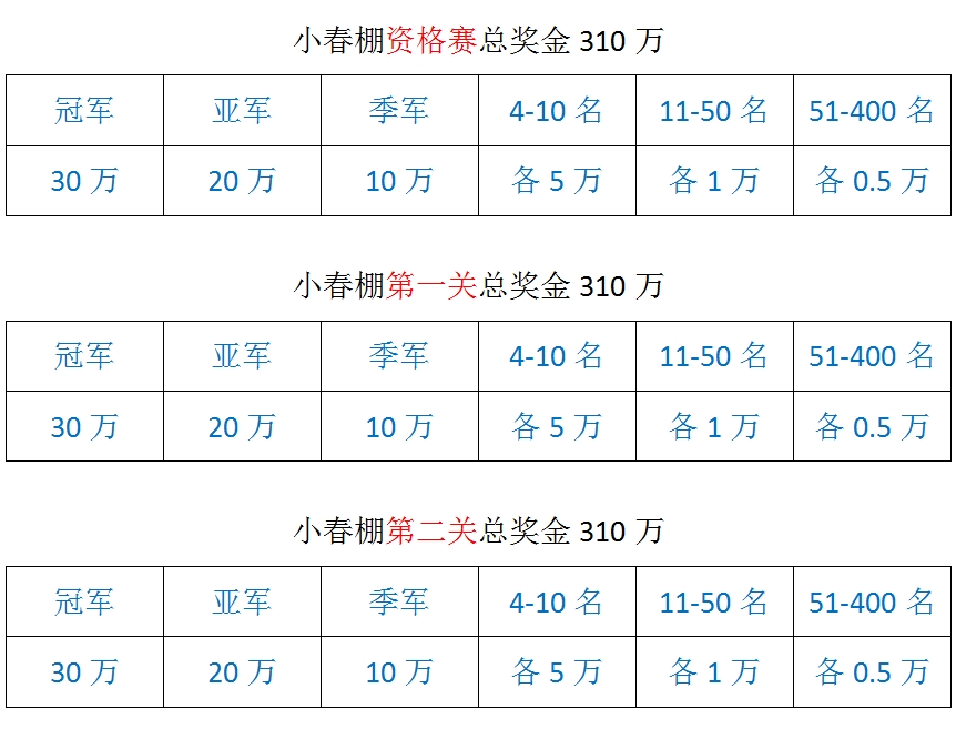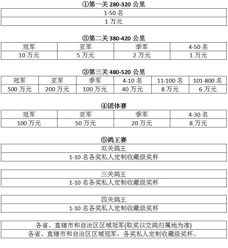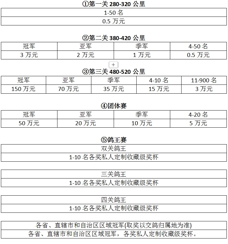 开尔小春棚在去年公布的各关比赛录取名额的基础上自200公里资格赛到400公里预赛各增400个获奖名额,共1200个单项奖,奖金额度在3250万的基础上再加930万,整体开奖羽数达到了8360羽。