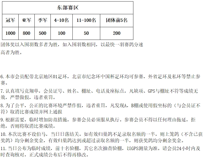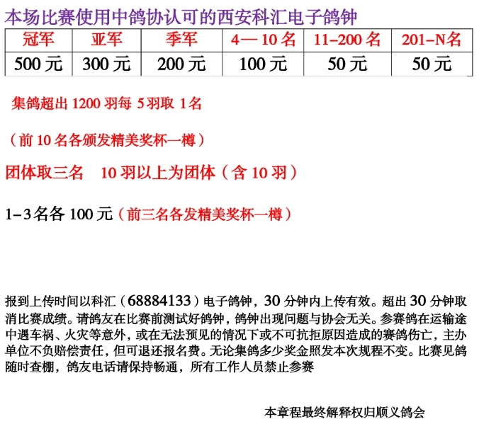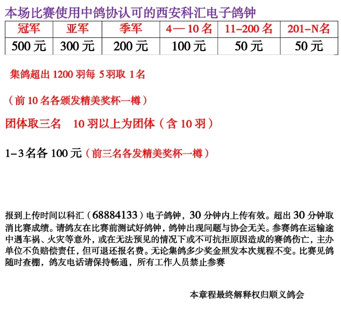 北京市顺义区信鸽协会290公里比赛,3月23日开笼,参赛费15元/羽。