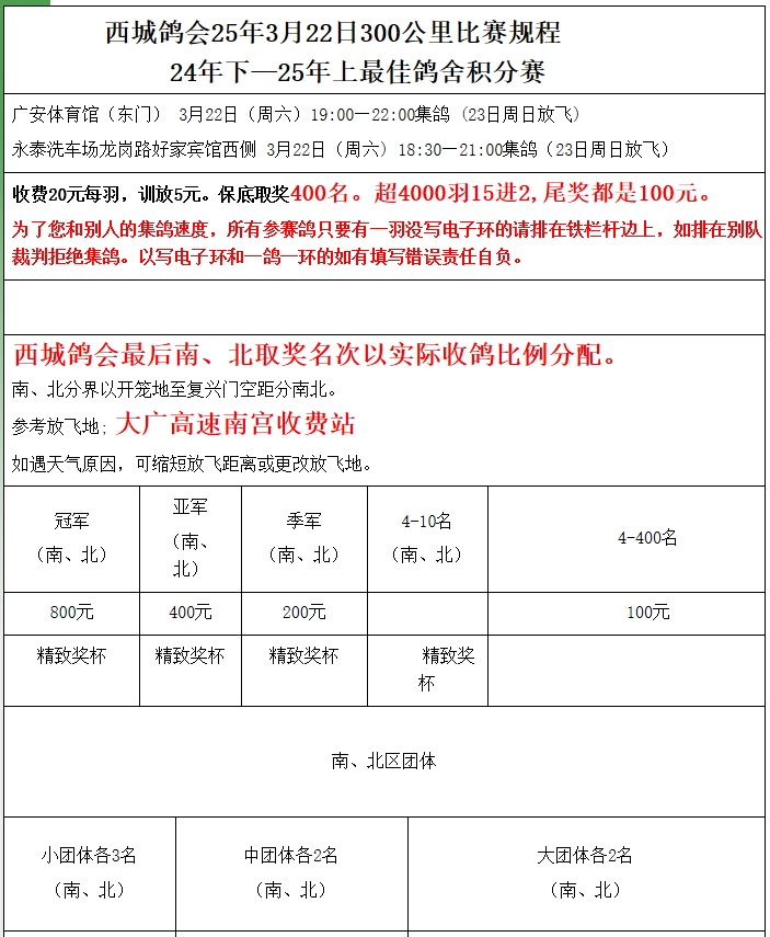 北京市西城区信鸽协会300公里比赛,3月23日开笼,参赛费20元/羽。