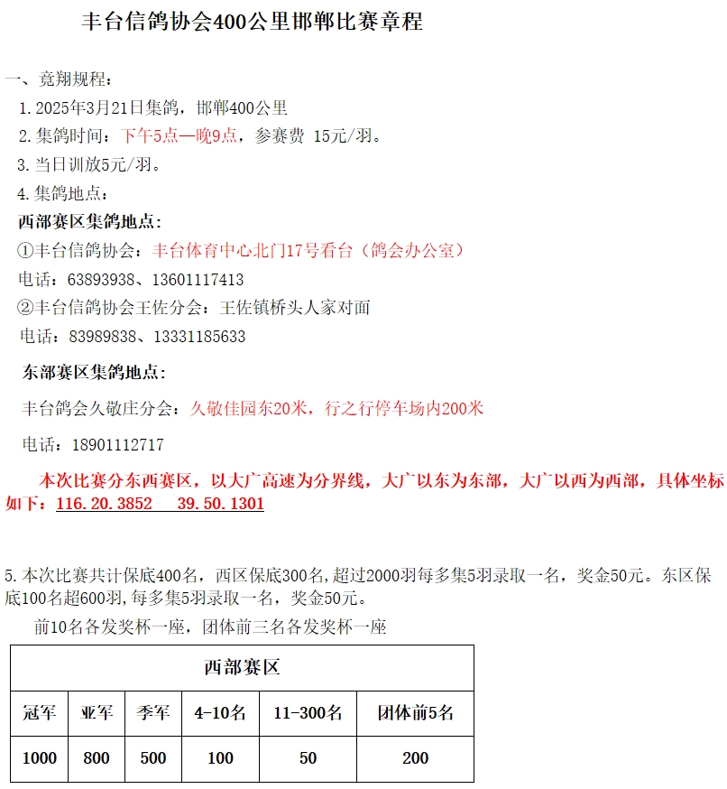 北京市丰台信鸽协会400公里邯郸比赛,3月22日开笼,参赛费15元/羽。