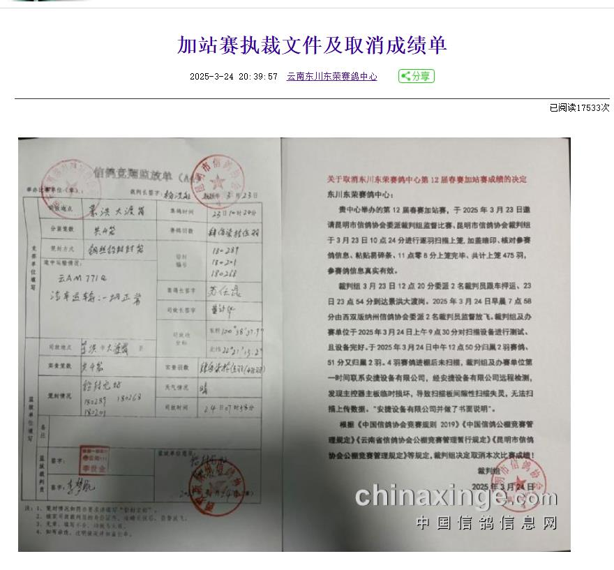 当日下午16点,公棚发布两则公告,对于不扫描的情况作出回应:3月24日,中午12点50分,归巢2羽赛鸽、51分又归巢2羽,4羽赛鸽进棚后未扫描。并且早在上午9点30分,裁判组及办赛单位就已对扫描设备进行测试,设备完好。后经安捷设备有限公司远程检测,发现主控器主板临时损坏。根据相关规定,裁判组决定取消本次比赛成绩!