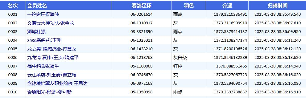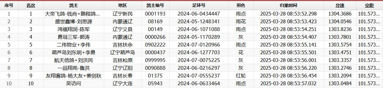 7点36分,辽宁天一国际春棚于新民新革大桥开笼放飞11532羽赛鸽。8点53分见鸽,前三甲以一秒之差拉开名次。大帝飞鸽-钱尚+鹏程鸽舍-王鹏名下的2024-06-0434447雨点以1304.3686米/分的速度获得冠军。盛世鑫博-刘思源的2024-05-1248341雨花紧随其后,以1304.0546米/分的速度摘下亚军,鸿福翔润-陈军的2024-06-1071088雨点以1303.8236米/分的速度取得季军。截至10点14分,已有1.1万羽小将归来,归巢率超九成。直播成绩>>