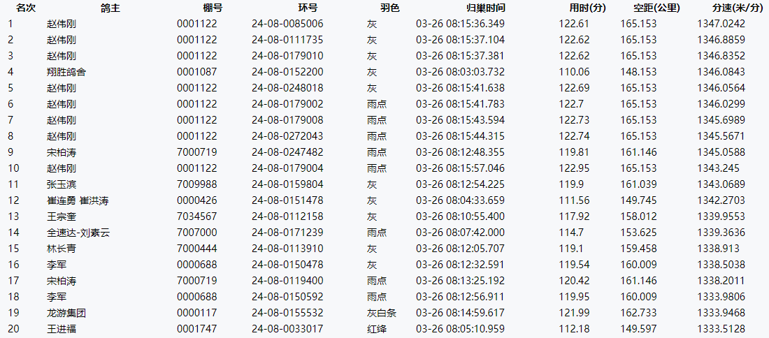 本次测试赛前十席位中,赵伟刚的赛鸽占据八羽,更是一举拿下前三。前三羽赛鸽成绩非常接近,第一名是赵伟刚名下2024080085006灰色赛鸽,报道时间08:15:36,飞行165.153公里,分速1347.0242米/分。第二名2024080111735分速1346.8859米/分,第三名2024080179010分速1346.8352米/分,真是十分默契。