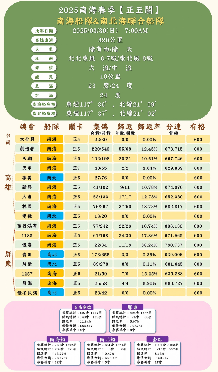 2025年南海春季正五关于2025年3月30日7点整在指定海域开笼,当日阴天有雨,东北风6-7级,大浪,能见度10公里,气温24℃,水温24℃,空距距离高雄港320公里。风急浪大,糟糕的天气给小将们的归巢之路带来巨大挑战。
