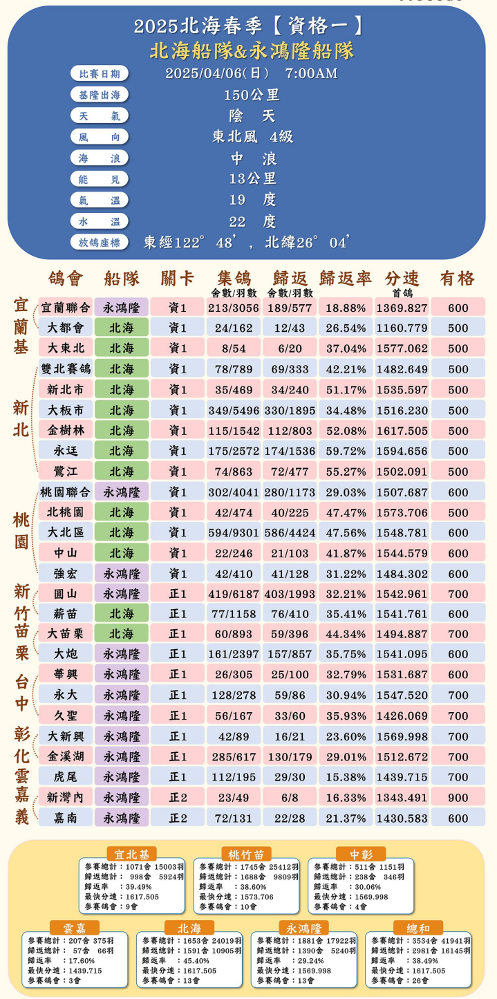 4月6日早晨7点,2025年台湾北海春季资格赛一正式打响。本次比赛共有26家鸽会,共计41941羽赛鸽参赛。海上开笼,司放地距离基隆港150公里,天气阴天,有4级东北风,中浪,能见度13公里,对于不少年轻小将来说是一次不小的考验。