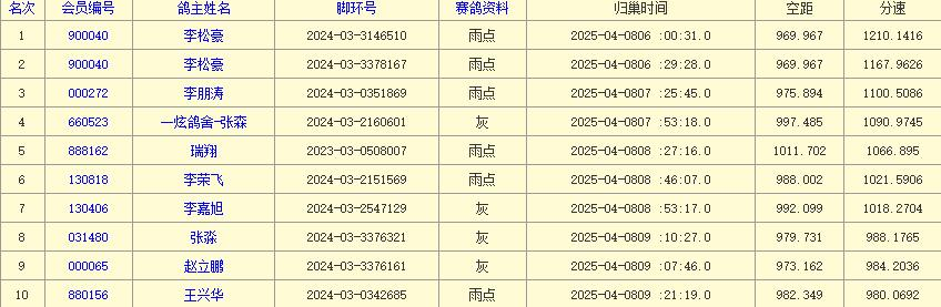 季军则由鸽友李朋涛的2024-03-0351869雨点以1100.5086米/分的速度斩获。截至4月8日9点40分,已有10羽凯旋,期待更多小将顺利归巢。