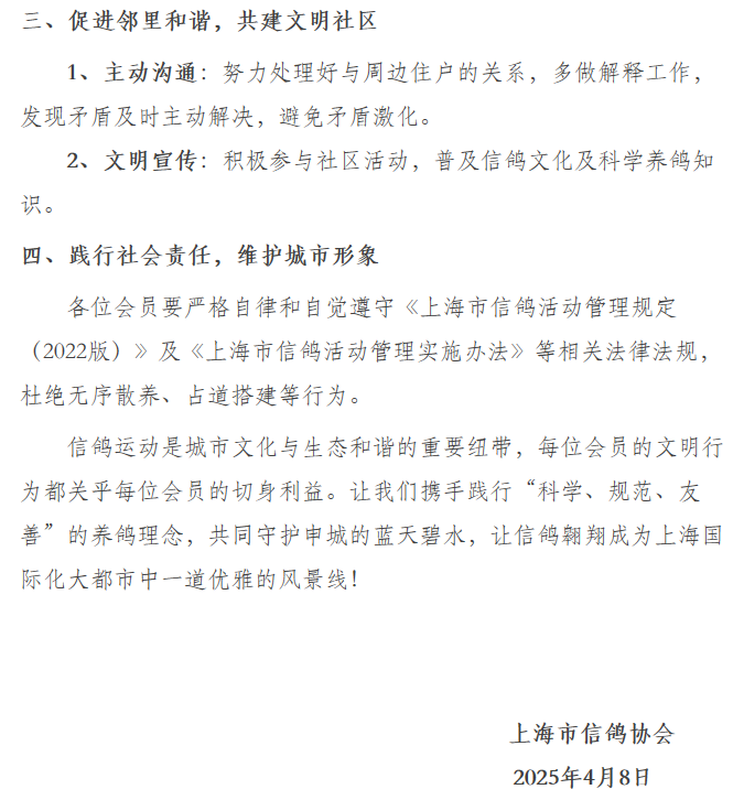 信鸽运动是城市文化与生态和谐的重要纽带,每位会员的文明行为都关乎每位会员的切身利益。让我们携手践行“科学、规范、友善”的养鸽理念,共同守护申城的蓝天碧水,让信鸽翱翔成为上海国际化大都市中一道优雅的风景线!