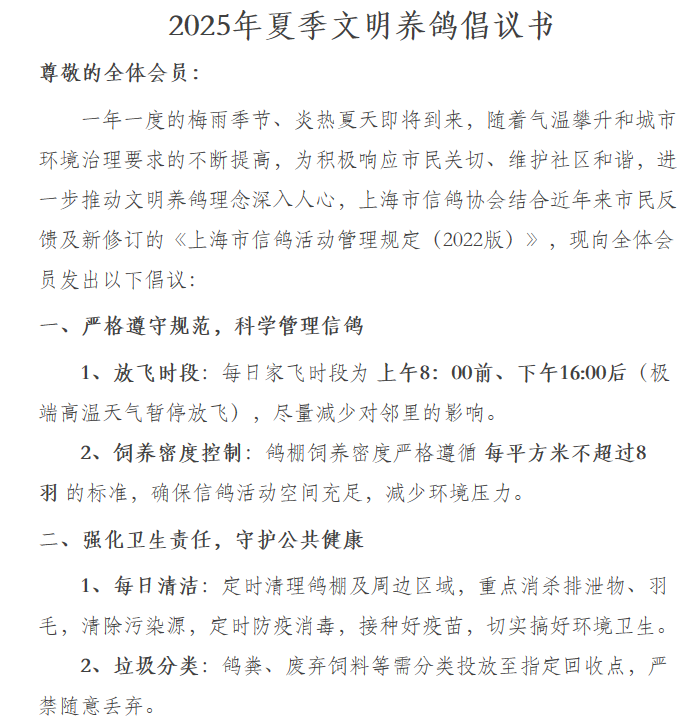 一年一度的梅雨季节、炎热夏天即将到来,随着气温攀升和城市环境治理要求的不断提高,为积极响应市民关切、维护社区和谐,进一步推动文明养鸽理念深入人心,上海市信鸽协会结合近年来市民反馈及新修订的《上海市信鸽活动管理规定(2022版)》,现向全体会员发出以下倡议: