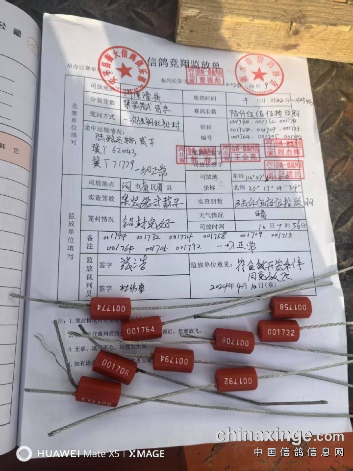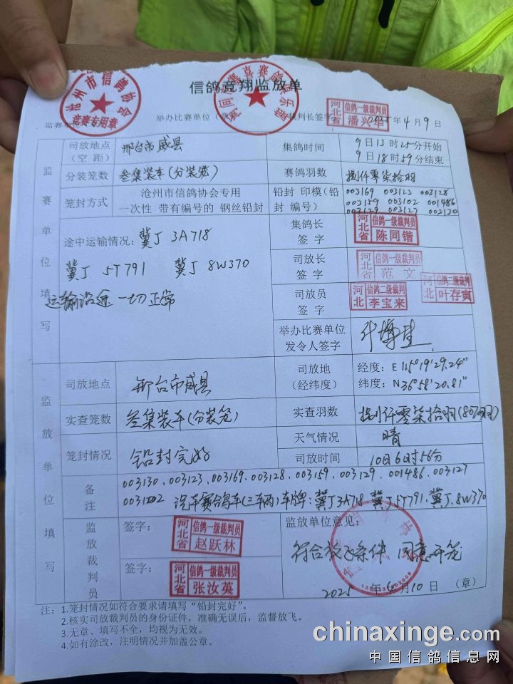4、河北凌波赛鸽公棚300公里比赛,在沧州信鸽协会委派裁判组的监督下于4月9日结束集鸽,共集鸽6599羽。4月10日早7点18分在河南范县开笼,参考空距294公里。点击查看直播链接>>