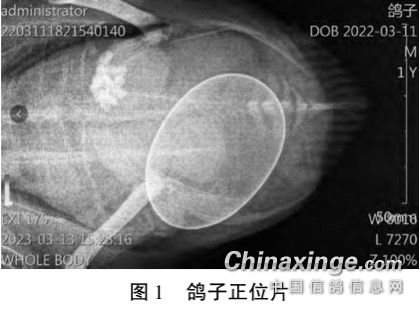 经过检查,这只鸽子精神不好,有点不安,体温、心率正常,但呼吸加快,食欲不好,饮水变多,腹部鼓起,羽毛竖着,尾部下压,肛门红肿,泄殖腔黏膜充血呈紫红色,腹腔能摸到蛋,位置比较靠前。拍X光片后,确定腹腔里有一枚比较大的成形鸽蛋,在龙骨突后缘。综合这些情况,就能诊断它是难产了。