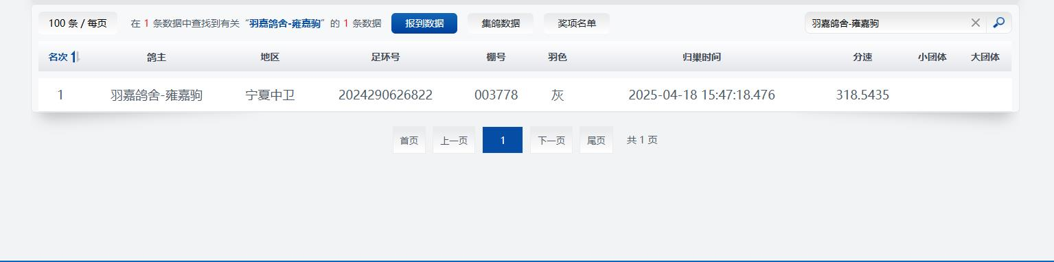 4月18日下午15点47分见鸽,冠军也随之揭晓。这羽灰鸽来自宁夏中卫鸽友羽嘉鸽舍-雍嘉驹名下,足环号为2024290626822,冠军分速318.5435米/分。期待更多小将顺利归巢!