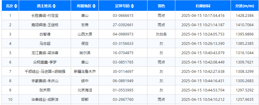 唐山尼尔森公棚同样于当日早晨5点50分在内蒙古赤峰开笼放飞,共集鸽5908羽,参考空距383公里。当日上午10点17分,鸽友长胜赛鸽-付定宝的一羽雨点03-0666615率先踩钟报到,分速1428.2384米/分,荣获冠军。当日归巢3928羽,归巢率66.49%。