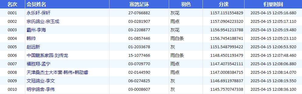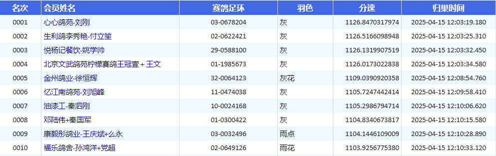 4月15日上午6点15分,开尔大春棚6627羽赛鸽开笼放飞,司放地内蒙古赤峰,比赛实际空距392.5公里,当日天气晴,最低气温只有3℃。当日中午12点03分见鸽,获得二关冠军的是心心鸽苑-刘刚一羽灰鸽03-0678204,分速1126.8470米/分。当日归巢2249羽,归巢率33%。