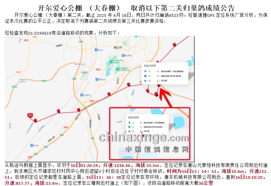 原因是——经过GPS工作人员检查轨迹发现,这些参赛鸽或多或少都有沿道路移动的现象,距离大约7-72公里不等,所以取消全部成绩。