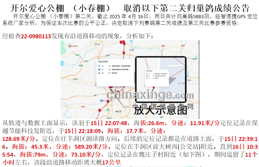 GPS工作人员检查轨迹发现,这些参赛鸽或多或少都有沿道路移动的现象,距离大约7-83公里不等,所以取消全部成绩。