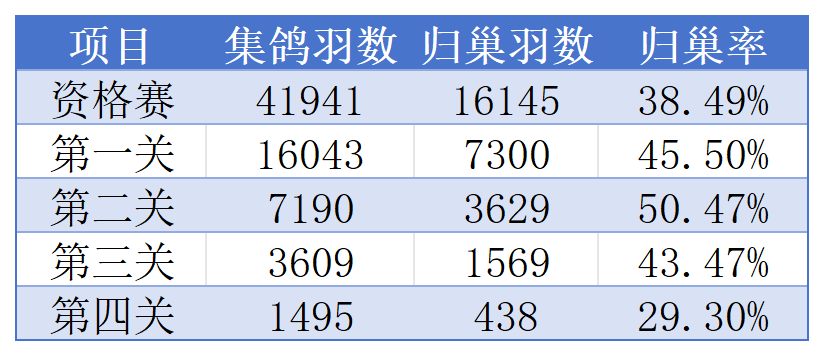 本次比赛总共归巢438羽赛鸽,综合归巢率29.30%,不足三成。其中归巢率最高的是永迋鸽会为37.30%,最低的是鹭江鸽会,为23.26%。