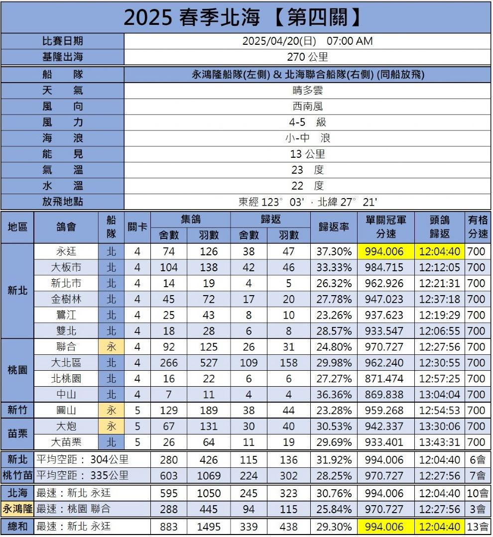 获得第四关冠军的是新北地区永迋鸽会的一羽鸽子,归巢时间4月20日12点04分,分速994.006米/分。