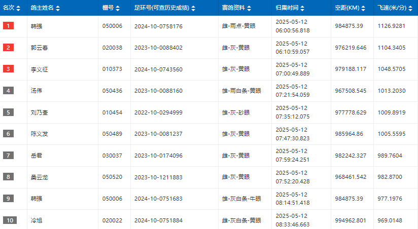 比赛当日未有赛鸽归巢。次日早晨6点,鸽友韩强的一羽黄眼雨点雌鸽强势归来,环号2024-10-0758176,分速1126.9281米/分,实际空距984.875公里,获得本次千公里冠军。鸽友韩强的另一羽牛眼灰白条雄鸽凭借977.1976米/分的分速获得第九名,前十占二羽。