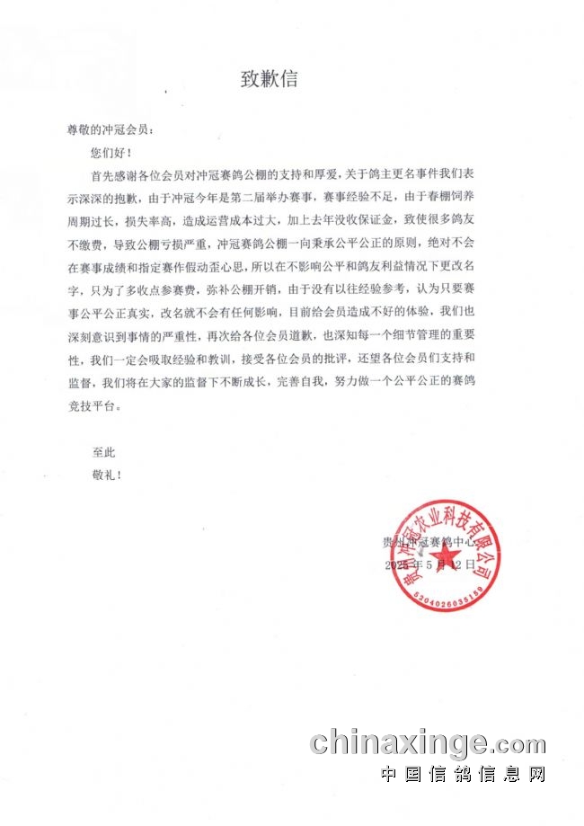 5月12日,贵州冲冠公棚发布公告,称“由于今年是第二届举办赛事,赛事经验不足由于春棚饲养周期过长,损失率高,造成运营成本过大,加上去年没收保证金,致使很多鸽友不交费,导致公棚亏损严重。”另外,公棚在公告中说明,“更改名字只为了多收点参赛费”。