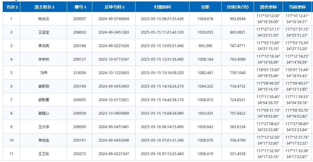 之后陆续有鸽归巢,4月15日共计归巢8羽赛鸽。第二羽于11点21分42秒报进,是来自王宝宝的2024-99-0451283,分速为865.0821米/分,飞行空距1030.055公里,位列第二。第三羽于13点5分21秒报进,是来自李洪亮的2024-99-0221626,分速为767.4771米/分,飞行空距993.396公里,位列第三。