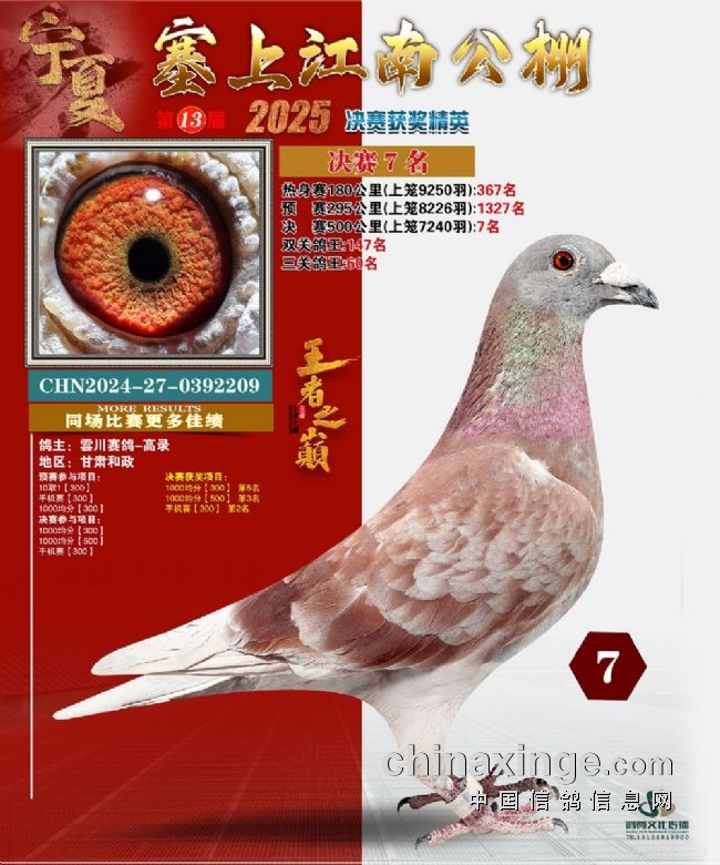 塞上江南公棚决赛前十名中有两羽赛鸽都是“红衣大将军”,彩鸽选手大放异彩。首先是决赛5名。这羽赛鸽来自甘肃鸽友朱星虎,除决赛5名外,这羽赛鸽同时还获得了双关32名、三关40名。决赛7名来自甘肃鸽友雲川赛鸽-高录的2024-270392209。一直以来,红绛鸽大多都作为过桥鸽使用,这两羽赛鸽证明了:只要培育好,绛鸽能种更能赛!