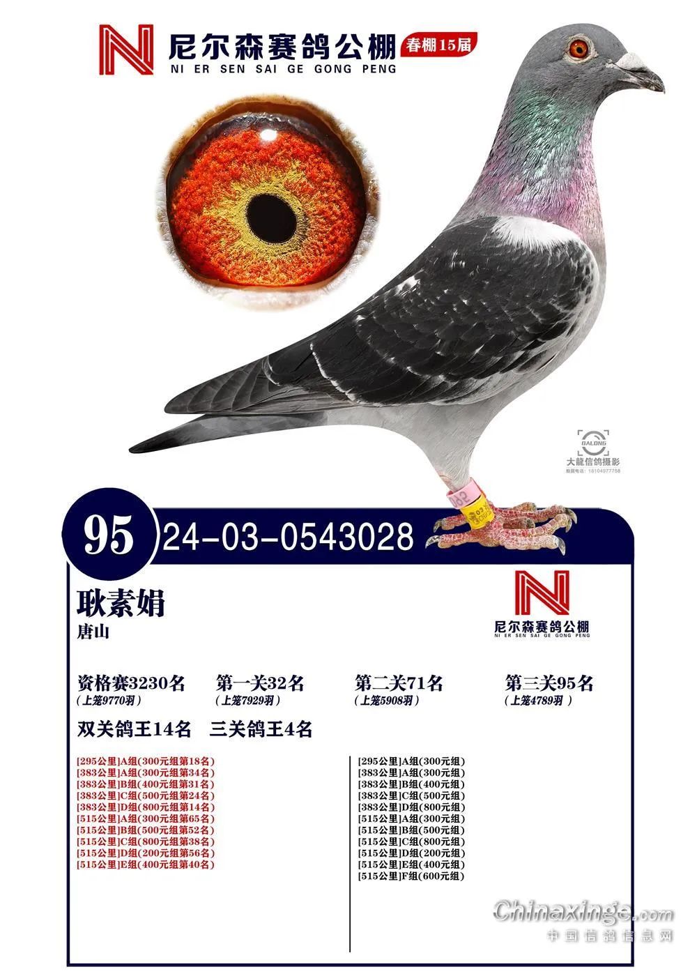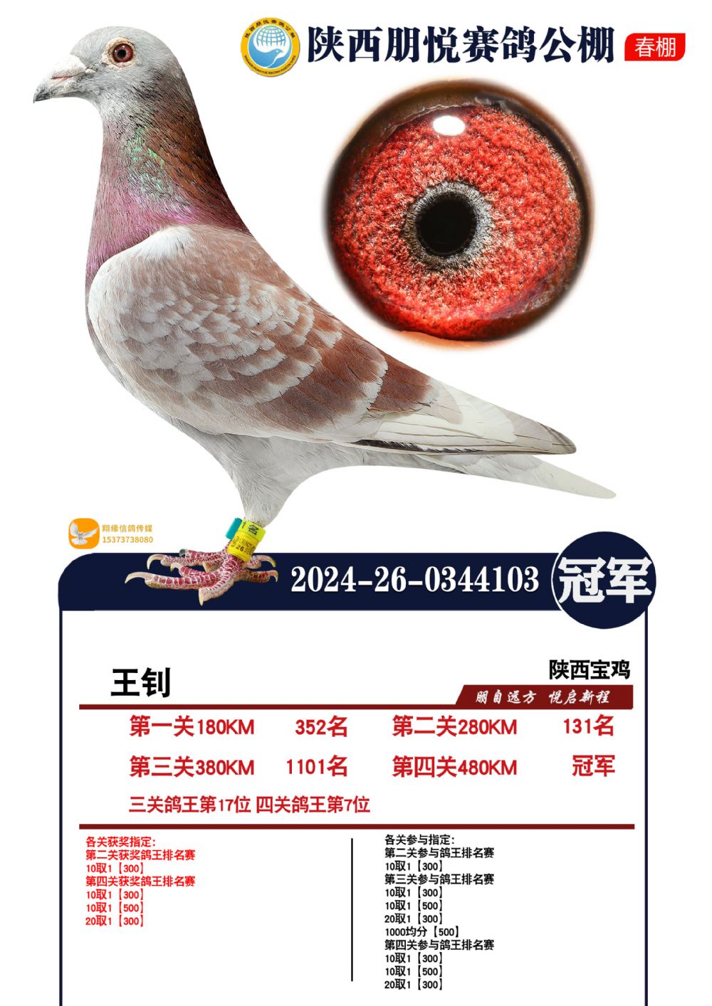 铁翼凌风英姿飒,一羽绛鸽立潮头。在陕西朋悦决赛的艰难挑战中,王钊麾下的2024-26-0344103绛鸽,超越三千多羽参赛鸽,在8小时的艰苦飞行后以999.9419米/分的速度率先抵达,荣膺冠军。不仅如此,这羽赛鸽前三关也给主人飞出了优异的成绩,除决赛冠军外,它还是四关鸽王7名、三关鸽王17名。
