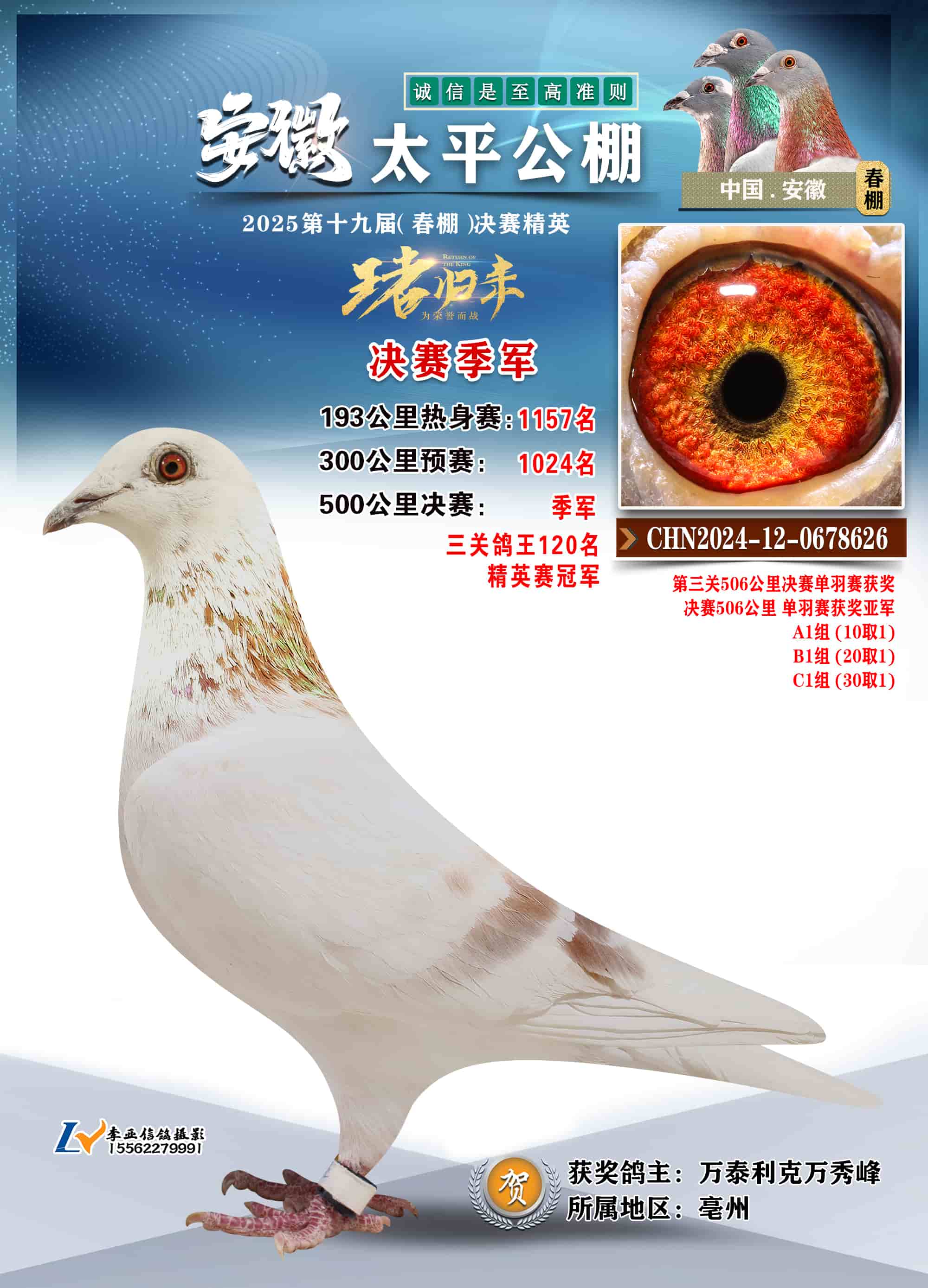 2025年是安徽太平公棚的第十九届春赛,参赛费1300元/羽,正赛分别为首关193公里、二关300公里、三关506公里,决赛共录取900名。当天开笼遇上5级西南大风,赛程后半段遇上3级西南风,经历了将近9个小时的艰苦飞行,鸽友万泰利克万秀峰的赛鸽2024120678626以970.7498米/分的分速获得季军。这是一羽羽色很特别的赛鸽,大面积白色加上一点绛色点缀,更衬的气质超凡脱尘。