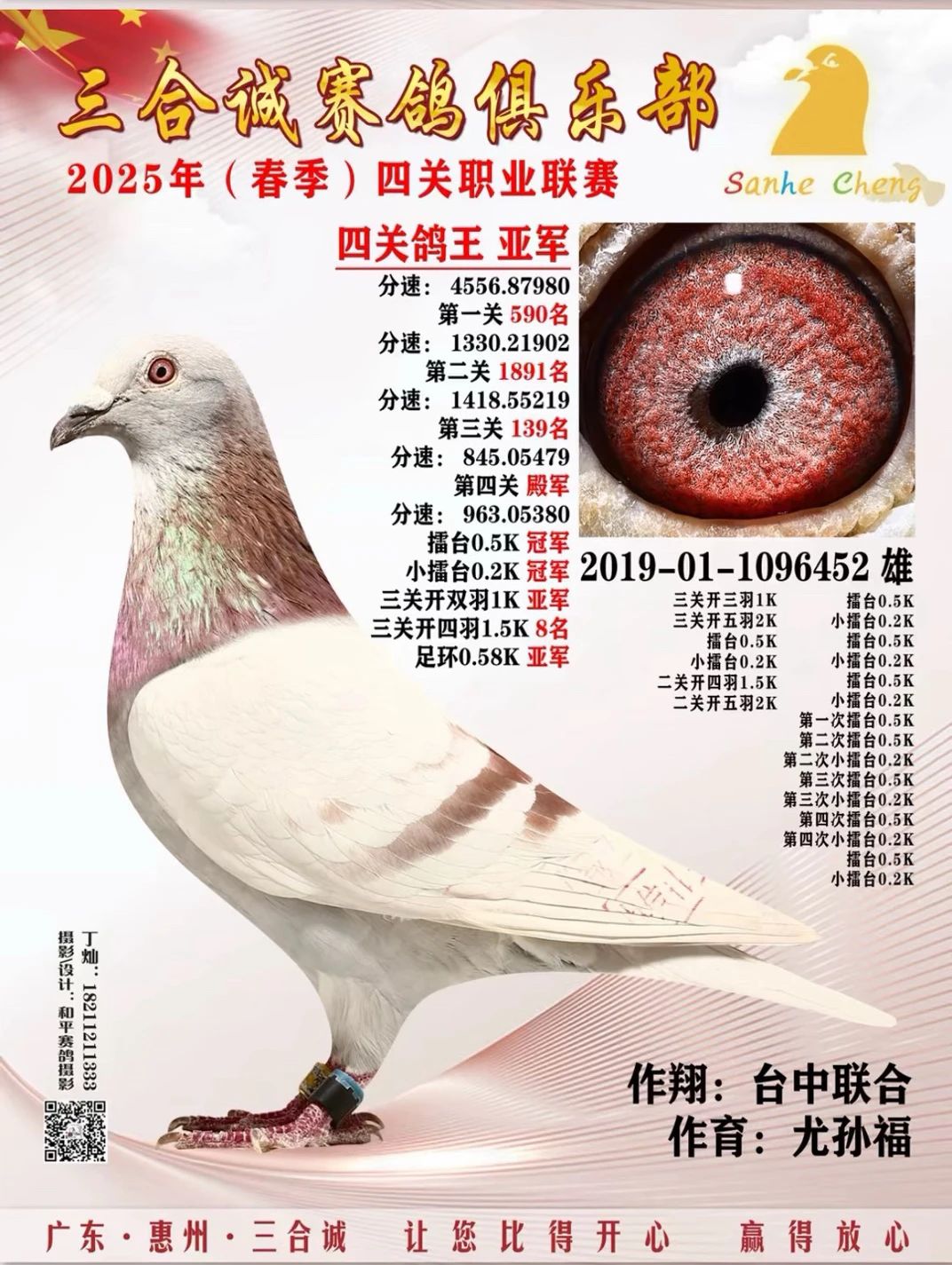 惠州三合诚俱乐部的春赛,三千羽起站,最后仅有五羽赛鸽入赏,堪称一场险象环生的“伯马赛”。打到决赛638羽赛鸽上笼,决赛殿军台中联合,寄养人尤孙福,环号1096452,飞行分速963.0538米/分,获得四关综合亚军。这羽成绩亮眼的绛鸽,在地形复杂、天敌环伺的比赛中成功晋级,飞出了艰难赛事的王者风范。