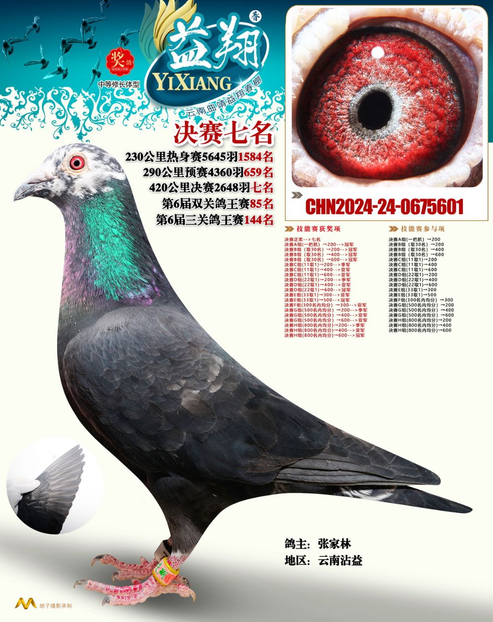 鸽主张家林的这羽获奖鸽很特别:浑身乌黑发亮的羽毛,头顶却有一片雪花白的斑点白,都说“挂白眉”的赛鸽不一般,这羽赛鸽的成绩也确实是出乎意料。云南益翔春棚(第六届)420公里决赛在大理永平境内开笼,共计放飞2648羽。这羽2024-24-0675601获得决赛7名。回看比赛,它的三关成绩一关比一关快,从千名之外飞奔到决赛7名,获得双关鸽王85名。相信未来会带给主人更多好运。
