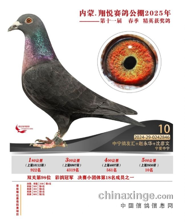 精选黄金赛线,铸就夺金赛场!内蒙古翔悦公棚今年是第十一届春赛,决赛取奖1200名,还设有彩鸽奖,真正把福利回馈鸽友。决赛在宁夏银川开笼,3850羽精英角逐。开笼六个小时见鸽,40分钟之内,前500名集体高分速归巢。决赛第十名中宁鸽友汇+赵永华+沈彦文的29-0242846是一羽鲜亮“黑皮大将”,不仅决赛高位,同时也是彩鸽组冠军,帮主人赢得多项奖励。