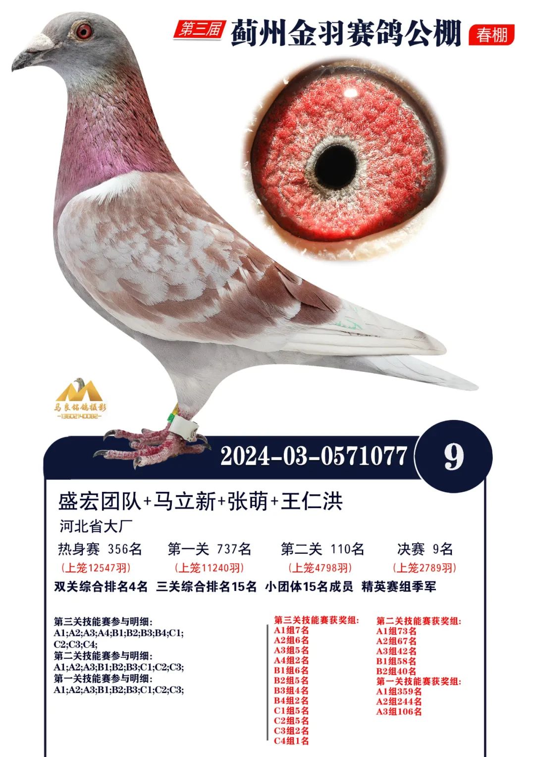 决赛9名,同时也是双关鸽王4名。这羽绛鸽来自盛宏团队+马立新+张萌+王仁宏的2024-03-0571077。热身赛356名、首关737名、二关110名、决赛9名。越是难飞的天气,这羽赛鸽越是找到了自己的能力,成功飞进高位,也为主人赢得了多项大奖。