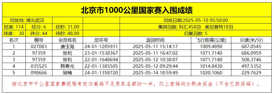 截至5月17日有效报道时间,467羽参赛鸽一共归巢5羽,比赛结束。