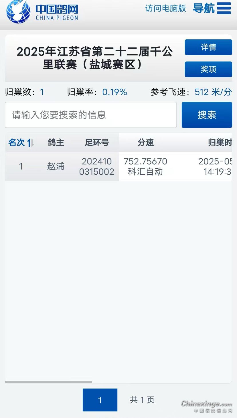 盐城市信鸽协会在5月20日14点19分,报到平台显示第一羽赛鸽归来!