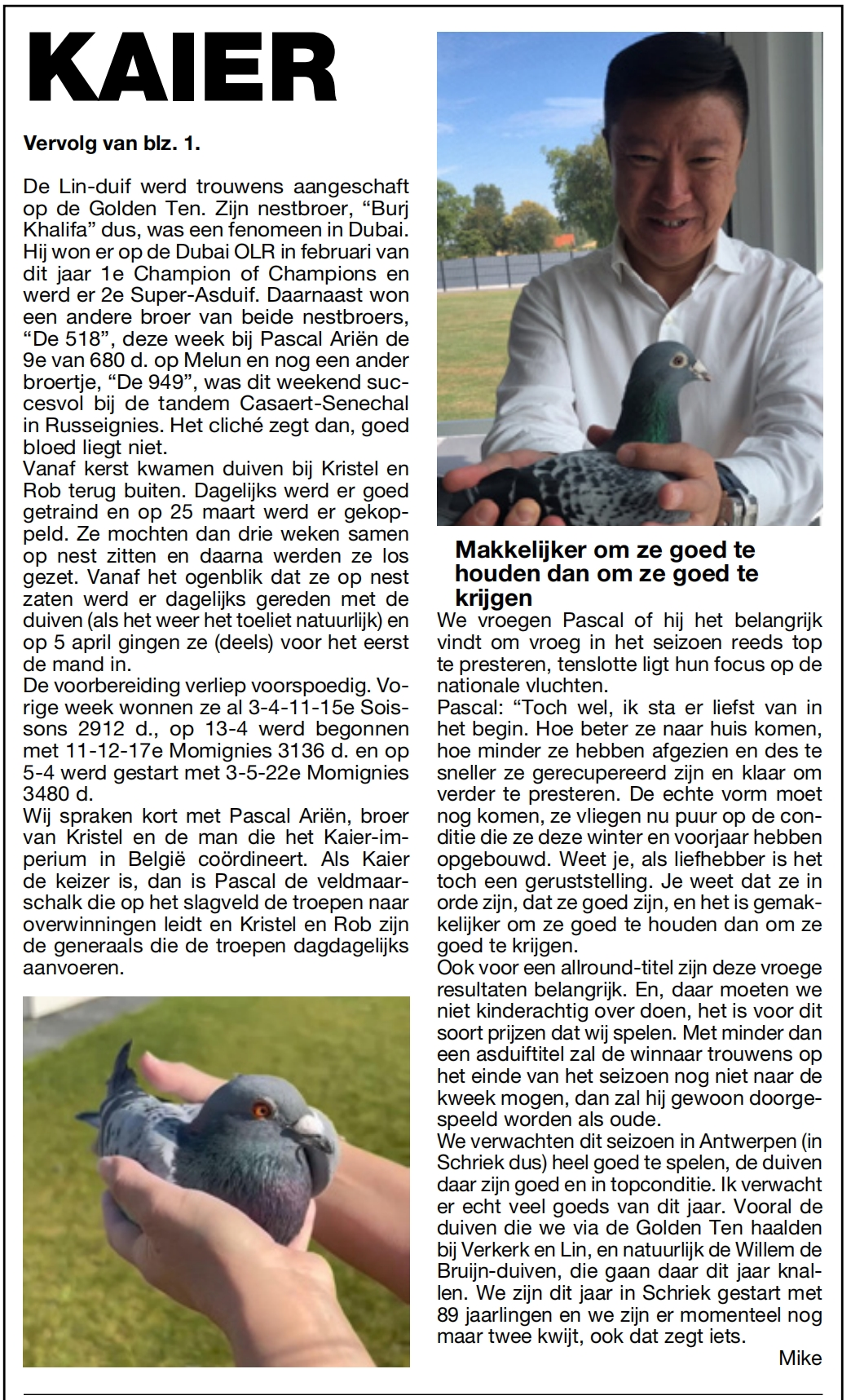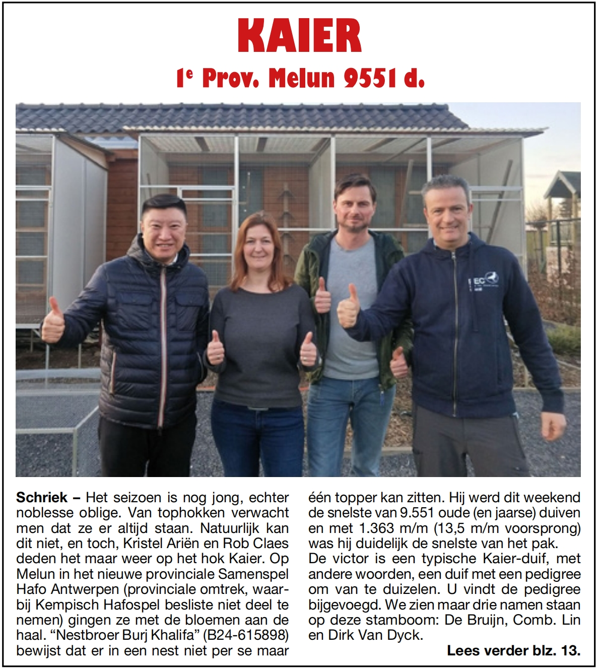 5月7日,比利时鸽界最具权威的百年媒体,创建于1888年的比利时鸽子报《DE DUIF》再次将开尔刊上头版头条——开尔欧洲战队在25年莫伦省际赛,安特卫普万羽赛事中强势问鼎!