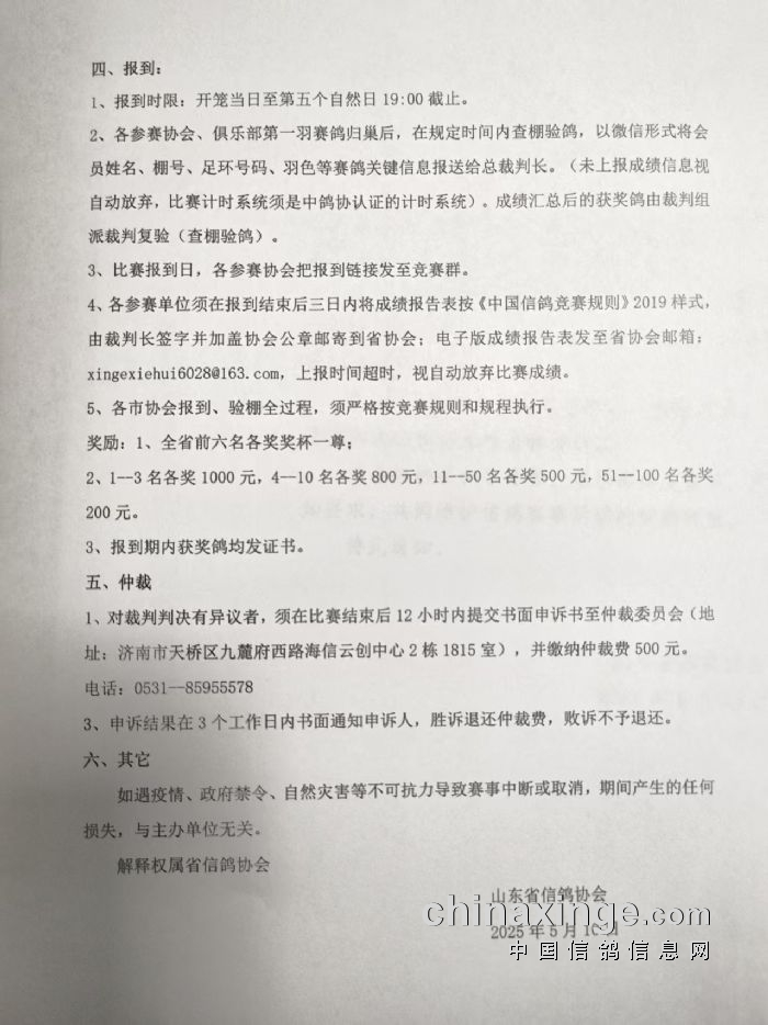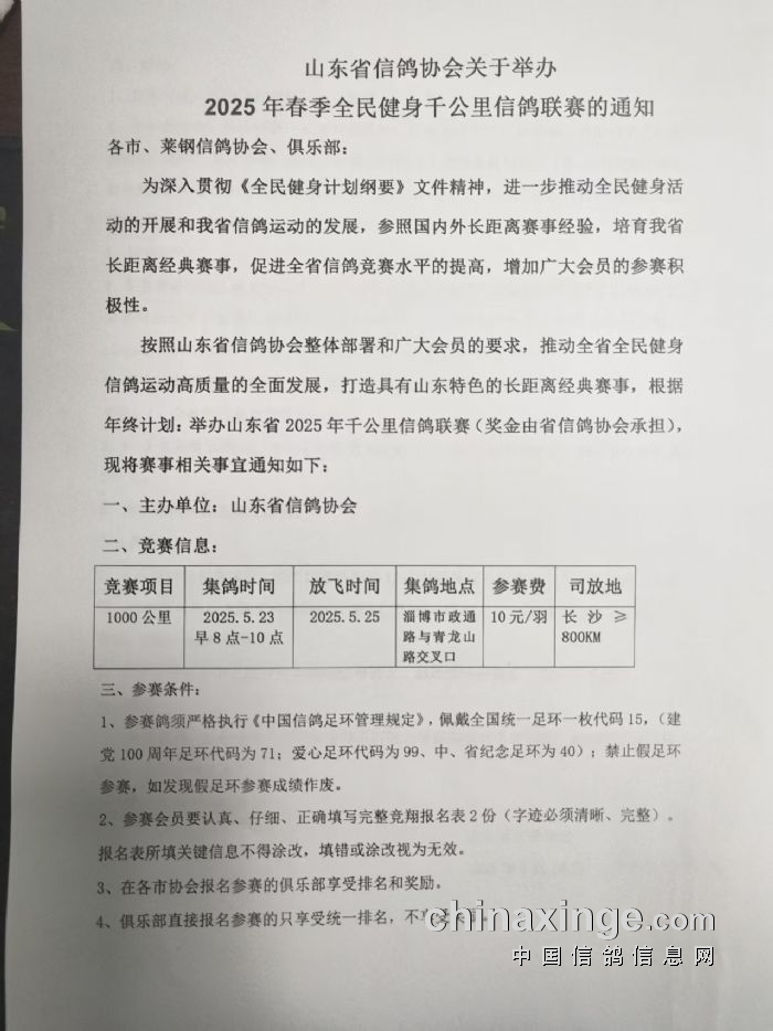 本届千公里联翔于5月23日8点-9点开始集鸽,集鸽地点为淄博市政通路与青龙山路口交叉处。按规程:收参赛费10元/羽,全省前六奖励奖杯一樽,1-3名各奖1千元,4-10名各奖8百元。取100个名次,尾奖2百元。