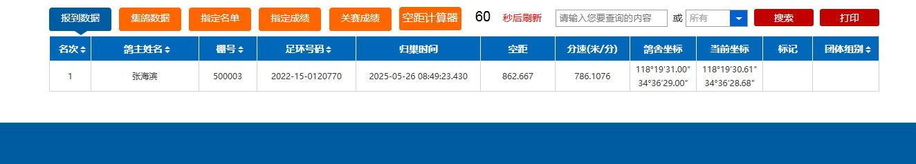 截至5月26日10点整,仅有一羽独归。来自张海滨的2022-15-0120770赛鸽于26日8点49分23秒报进,飞行空距为862.667公里,分速786.1076米/分,暂列第一名。