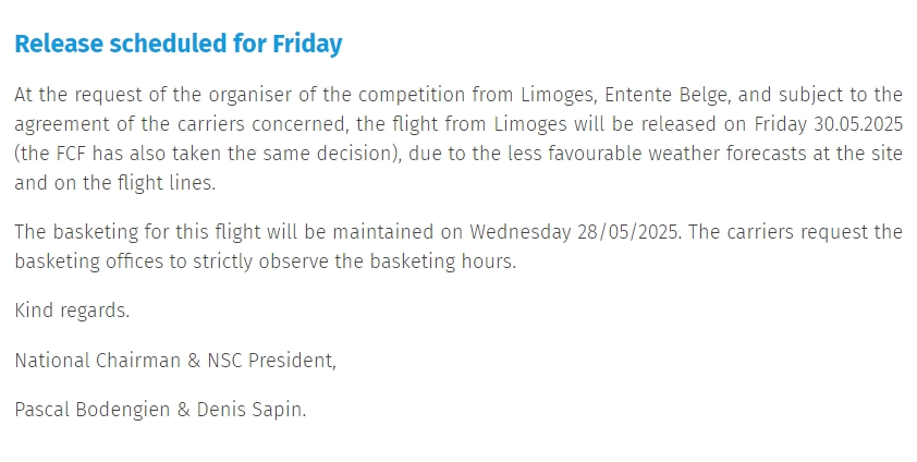 应比利时联合鸽会利蒙治赛事主办方要求,并征得相关承运人同意,原定2025年5月30日(周五)放飞的利摩日赛事将延期(法国鸽协已作出相同决定),因司放地和赛线沿途天气预报不利。