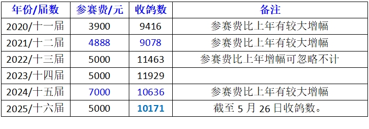 去年参赛费从2023年的5000元提高至7000元,增幅40%,年收鸽羽数曲线再次下拐。其实从爱翔的历年收鸽羽数分析,凡提高参赛费的次年,收鸽量均是重新反弹创新高地。但爱翔高层综合考虑近几年受疫情影响,经过广泛调研与征求鸽友意见,第一次降参赛费、重新恢复到5000元。