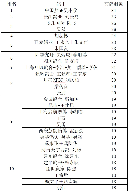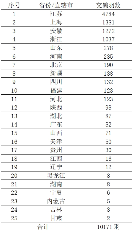 来看一下5月26日爱翔收鸽10171羽的省区市排行,江苏鸽友以交鸽4784羽高居榜首,主场嘛,坐头把交椅,必须的!其次是上海、安徽和浙江均在千羽之上,是参赛主力军,其余21个省区市,交鸽羽数几百到几十到个位数不等,但足以反映爱翔的影响力范围之广、已近乎辐射全国。
