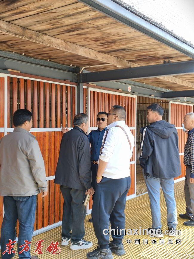 爱翔董事长李伦(中)向鸽友介绍公棚发展情况。