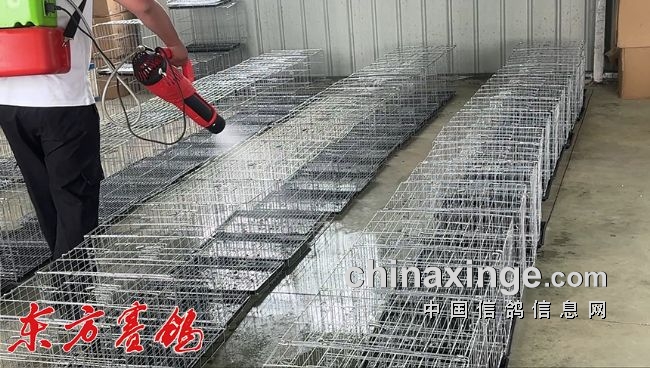接鸽前春棚工作人员对幼鸽观察笼进行消毒
