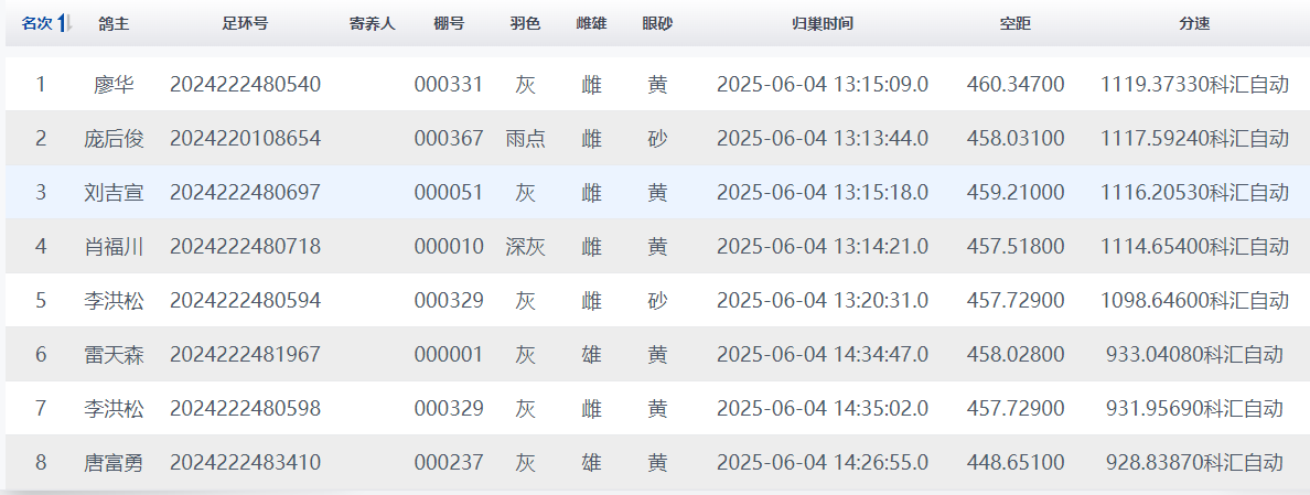 冠军:13时15分09秒,鸽友廖华的一羽黄眼灰色雌鸽2024222480540顺利归巢,分速1119.3733米/分,实际空距460.347公里,拿下本次决赛冠军宝座。