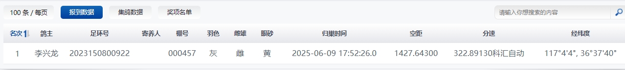归巢消息:首羽鸽归巢!开笼第五天,6月9日下午17点52分,鸽友李兴龙的一羽2023150800922黄眼灰雌打钟归巢,飞行空距1427公里,分速322米/分。