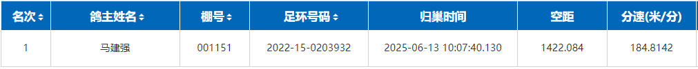 又传来好消息!6月13日上午10时07分,鸽友马建强的一羽2022-15-0203932顺利归巢!飞行分速184.8142米/分,实际空距1422.084公里!是山东省首届1500公里超远程多会联翔的第二羽归巢鸽。